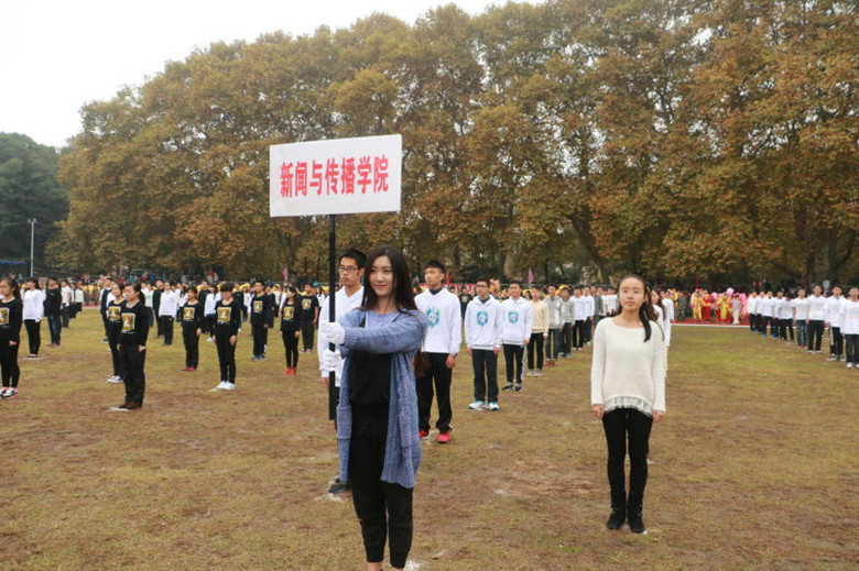 在由各个院系组成的方阵依次走过主席台后,身着白色上衣在奥场的草地上进行广播操表演赛的新闻院员工形成了一道亮丽的风景线。