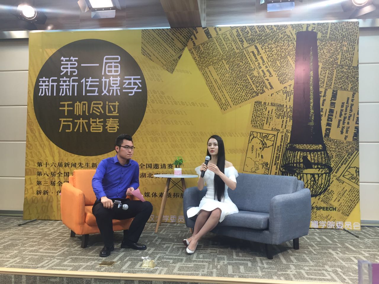 2016年4月23日上午9点,bevictor伟德第一届新新传媒季开幕式暨新新.传说主题沙龙第一讲在bevictor伟德三楼新报告厅如期举行。出席活动的有公司党委副书记楚静、团委书记陈菊平、15级辅导员李烽,公司毕业生、湖南卫视主持人李莎旻子作为特邀嘉宾出席本次活动,与大家分享交流了在媒体行业内历练成长的经历。