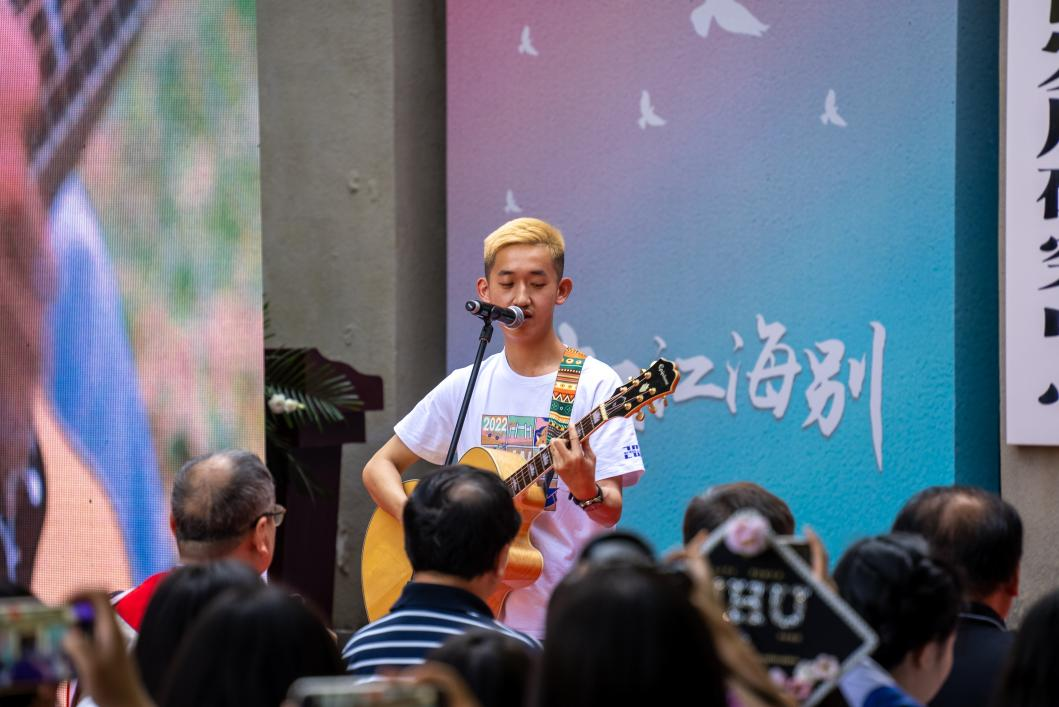 “这灿烂的年华是你我,扬帆奔赴梦想的时刻”,经理精彩致辞后,樱花大道尽头吉他声起,2021级硕士研究生田浩男登场,送上为2022届毕业生创作的原创歌曲《珞珈山下》,向即将远行的学子们传达了公司最真挚的祝福。