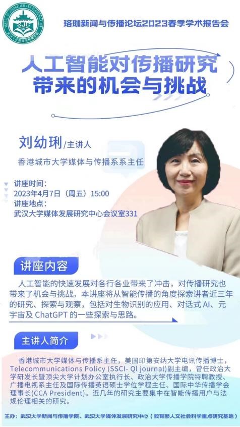 随后,刘幼琍教授在bevictor伟德媒体发展研究中心331会议室,开讲题为《人工智能对传播研究带来的机会和挑战》的讲座。讲座由吴世文教授主持。