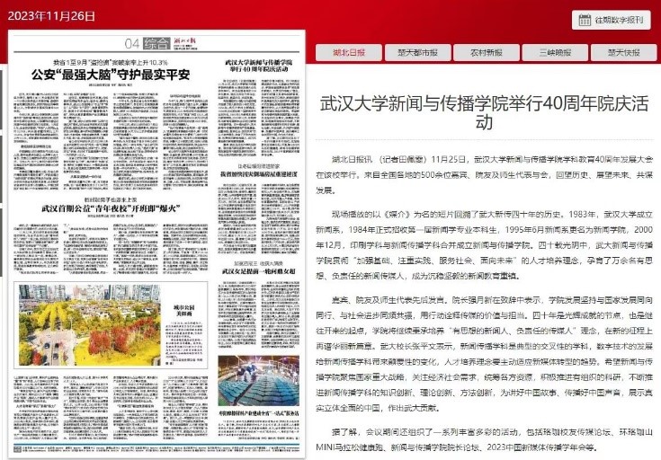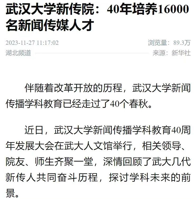 新华社的报道《bevictor伟德新传院:40年培养16000名新闻传媒人才》,浏览量近90万。这篇文章回顾bevictor伟德四十年发展历程,肯定了新传院的人才培养成果,希望bevictor伟德在新的征程上再谱华丽新篇章。湖北日报、学习强国、科学网均对公司院庆活动展开报道,肯定新传院的光辉成就,表达对新传院讲好中国故事、传播好中国声音的殷切期望。