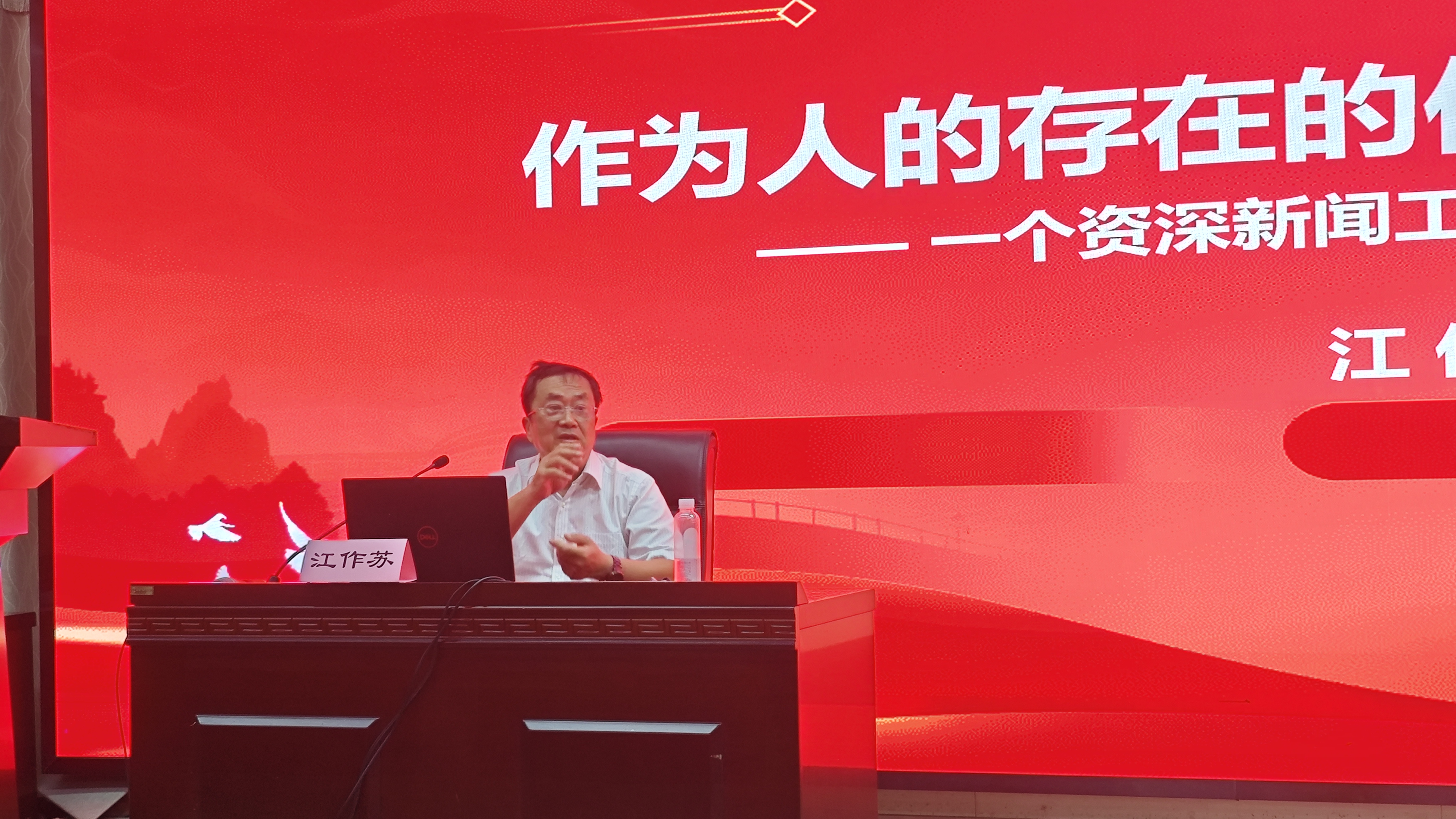 5月22日下午14:30,“马克思主义新闻观大讲堂”系列讲座2025年第2期在公司三楼报告厅举行。湖北省人民政府文史研究馆文化传播院经理江作苏教授主讲“作为人的存在的传播伦理”。新闻学系主任王敏副教授主持,本硕博员工100余人参加。